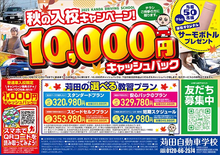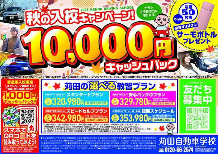 普通車でご入校の方は通常料金より、なんと10,000円キャッシュバック!